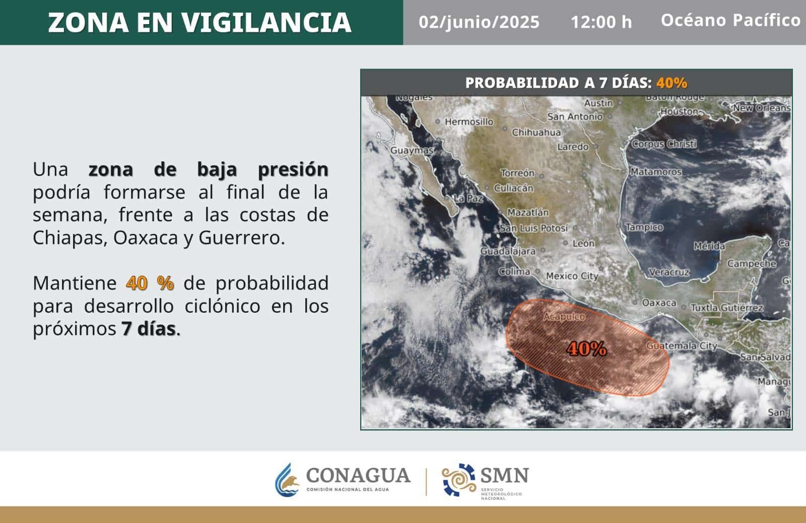 Con un 40% de desarrollo ciclónico, las autoridades estatales piden a la población mantenerse informados Ante la presencia de una zona de baja presión en las costas del Pacífico y que reportan con un 40 por ciento de desarrollo ciclónico…