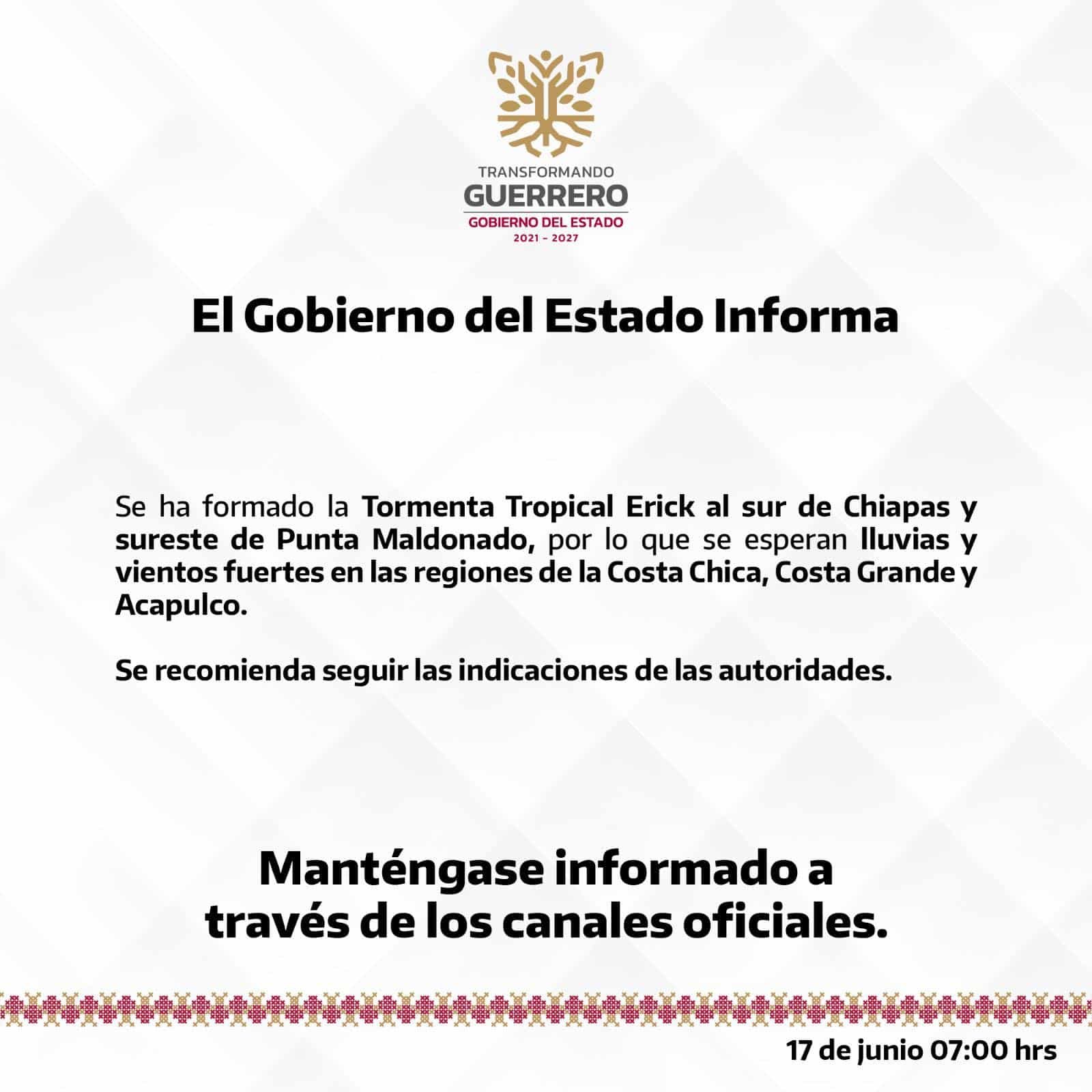 Entre el miércoles o jueves se espera toque tierra como posible ciclón la tormenta tropical Erick, de acuerdo al informe que dieron a conocer las autoridades de Protección Civil y quienes han puesto en alerta a los municipios del estado de Guerrero, para prepararse ante esta posibilidad latente contra la entidad guerrerense.