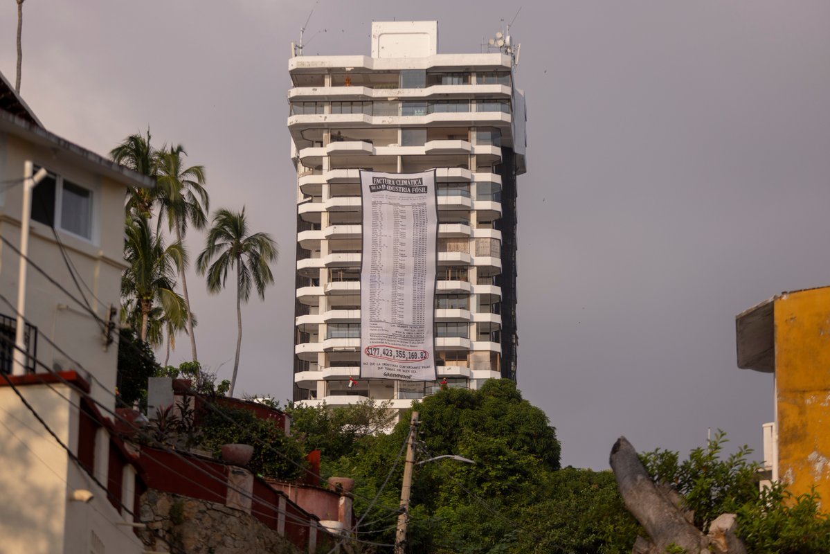 Integrantes de Greenpeace México realizaron una manifestación para exigir justicia climática para Acapulco y denunciar la responsabilidad de las grandes empresas fósiles en los daños ambientales que afectan al país. Como parte de su acción, los activistas escalaron una estructura y desplegaron una enorme lona con un mensaje que simboliza “la deuda climática” que, según la organización, asciende a más de 177 mil millones de pesos por los impactos derivados de la contaminación y los desastres naturales agravados por el cambio climático.