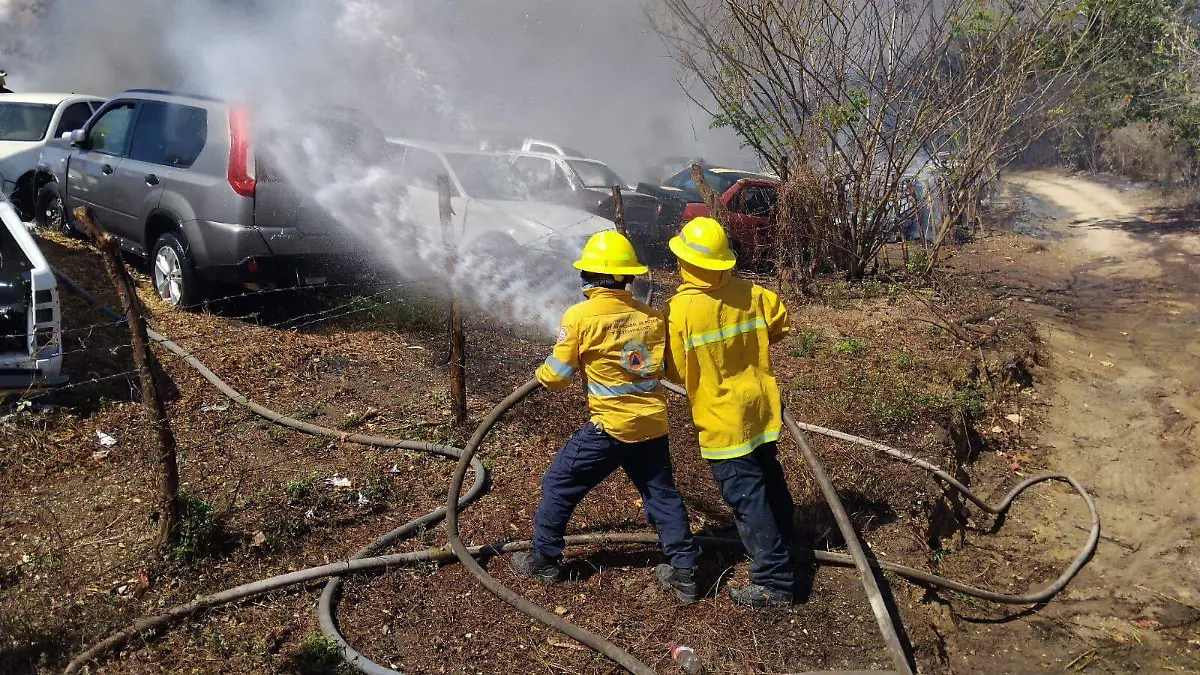 Una intensa jornada de combate al fuego se vivió en un corralón de vehículos chatarra en Acapulco, donde brigadistas lograron sofocar un incendio tras más de siete horas de labores continuas. El siniestro, ocurrido en la localidad de San Antonio, dejó como saldo alrededor de 700 unidades calcinadas y daños en aproximadamente cuatro hectáreas de pastizales cercanos a la carretera federal hacia Pinotepa.