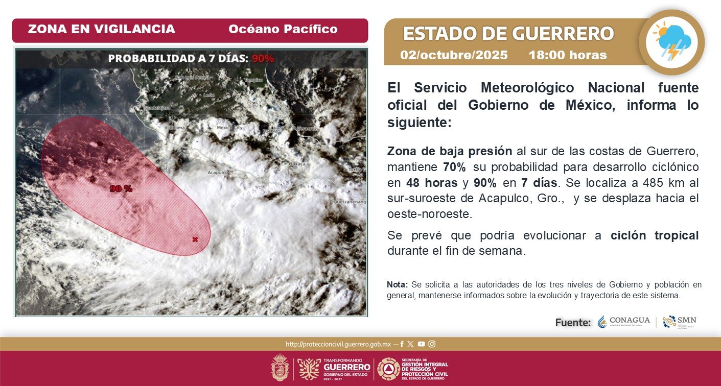 Las precipitaciones están relacionadas con una zona de baja presión en el océano Pacífico, que presenta una alta probabilidad de convertirse en ciclón tropical durante el fin de semana. Aunque no se prevé un impacto directo en Guerrero, el sistema genera nubosidad, lluvias intensas, ráfagas de viento, oleaje elevado y actividad eléctrica, especialmente durante las tardes y noches.